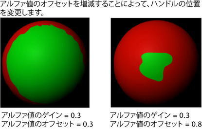 ハンドルの位置を変更するには、アトリビュート エディタ(Attribute Editor)でテクスチャのカラー バランス(Color Balance)セクションを展開します。アルファ値のオフセット(Alpha Offset)値を増減します。