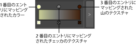 次の例を検討します。3 つのエントリがランプに組み入れられています。1 番目はカラー エントリ、2 番目はチェッカのテクスチャ、および 3 番目は山のテクスチャです。
