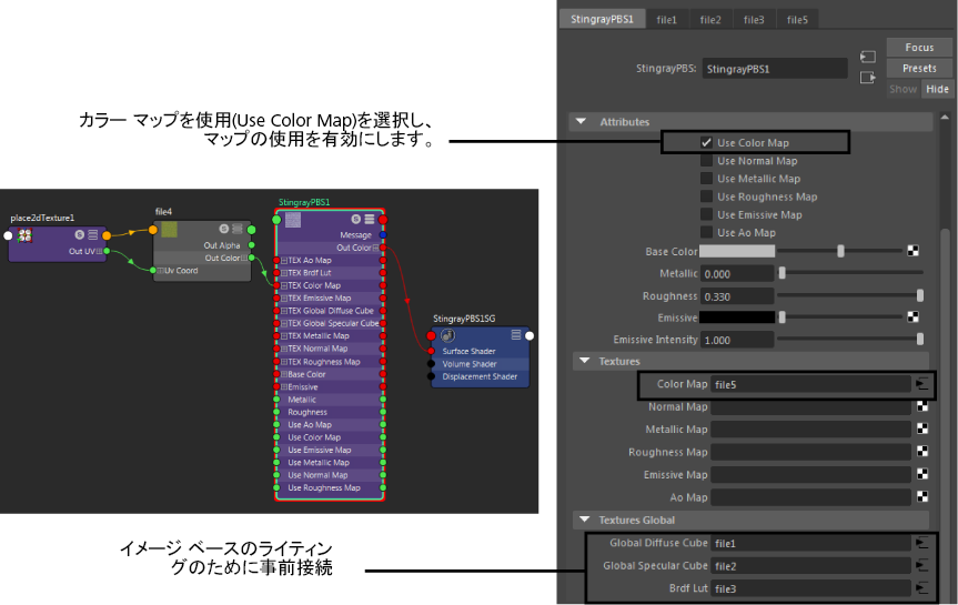 ファイル(File)ノードの OutColor 出力を、Stingray PBS ノードのマップ入力アトリビュート(TEX Color Map など)に接続します。