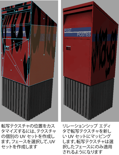 シーンのさまざまなテクスチャに複数の UV セットを使用できます。これによりテクスチャごとに配置を変えることが可能です。各種 UV 編集ツールを使用して、現在のテクスチャ ノードだけでなく、そのテクスチャを移動することができます。