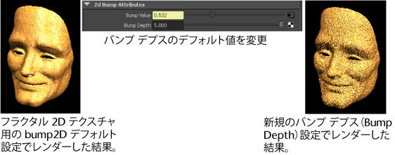 バンプ深度(Bump Depth)または、テクスチャのアルファ値のゲイン(Alpha Gain)とアルファ値のオフセット(Alpha Offset)を調整することによって、ほとんど同じエフェクトを実現できます。バンプ深度(Bump Depth)は、テクスチャのアルファ値のゲインの値を読み込むことによって決定されます。複雑なシェーディング ネットワークの中で複数のバンプマップがある場合は、両方を調整すると便利です。アルファ値のゲイン アトリビュートでは、各テクスチャのバンプ マップを個別に調整できます。