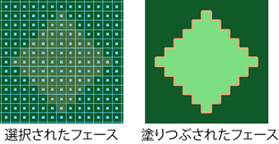 選択したフェース(Selected Faces)をオンにすると、塗り潰しペイント(Flood Paint)ボタンと塗り潰し消去(Flood Erase)ボタンで、ポリゴンの選択したフェースを塗り潰すことができます。