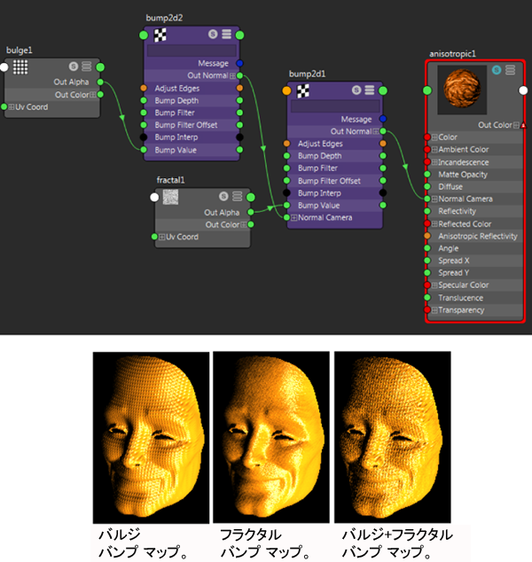 - ハイパーシェード(Hypershade)で 2 つの 2D テクスチャと 1 つのマテリアルを作成します。この場合は、フラクタル(Fractal)、バルジ(Bulge)、異方性(Anisotropic)です。