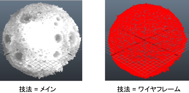 このシェーダでは、2 つのテクニックが定義されています。シェーディング ビューを表示するメイン テクニックと、テッセレーションを示すワイヤフレームを表示するワイヤフレーム テクニックです。テッセレーションの内部レベルと外部レベルを設定するには、内部レベル/100*100 pix (Inner levels/100*100 pix)設定(100 x 100 ピクセル領域内の内部レベル数)と外部レベル/30 pix (Outer levels/30 pix)設定(30 ピクセル セグメントごとのレベル数)を調整してその効果をビューポート 2.0 (Viewport 2.0)で確認します。