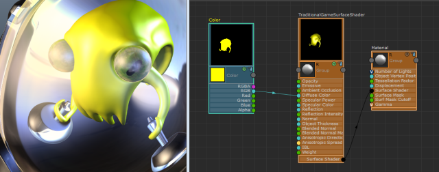 高価なノイズやパターンを混合してから、ベイク処理してゲーム エンジンに書き出すことができます。ShaderFX では、ノードをステッチし、ビューポート 2.0 でリアル タイムにプレビューしてから、オブジェクト用に UV ベースのテクスチャをベイク処理することができます。