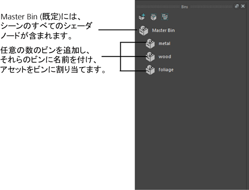 既定の Master Bin には、シーン内のすべてのシェーディング ノードが収納されます。シーンに任意の数のビンを追加し、ノードを 1 つまたは複数のビンに割り当てることができます。ビンを戦略的に命名することによって(たとえば、木目、金属、ドア、葉)、ビンに関連するシェーディング アセットを迅速かつ容易に見つけることができます。