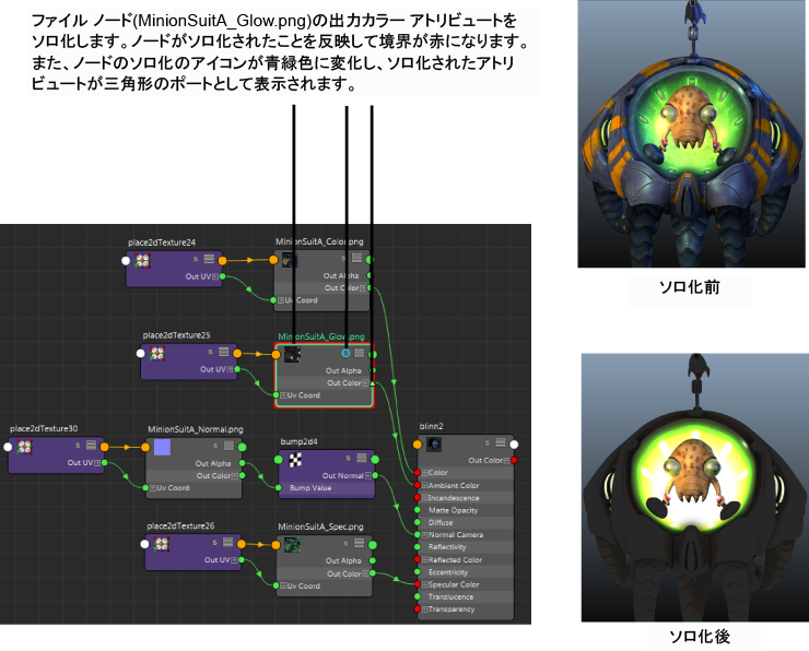 ノードをソロ化するには、ノードのソロ アイコンをクリックするか、マーキング メニューを使用するか、ノードの名前を soloMaterial MEL コマンドに渡します。ノードをソロ化するときは、アトリビュートを指定することもできます。指定しない場合は、既定のアトリビュートがソロ化されます。