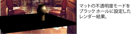 ブラック ホール(Black Hole)モードを選択すると、マテリアルのマット チャネルが 0 (完全な透明)に設定されます。すなわち、シェーダに割り当てられたオブジェクトがマットを「ノック アウト(抜き合わせ処理)」してレンダーするブラック ホールがアルファ出力に作成されます。