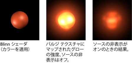 レンダーしたときに、グローのエフェクトだけを表示してサーフェスは可視にしません(グローの強度(Glow Intensity)値が 0 でない場合)。ソースの非表示(Hide Source)の既定値はオフです。