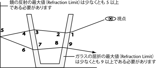 リアルなガラスをシミュレートするには、屈折の最大値(Refraction Limit)を 9 または 10 に設定してください。