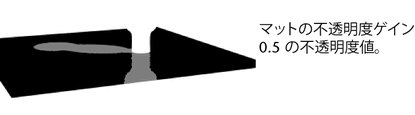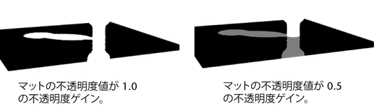 マット チャネルをまず計算し、それから指定したマットの不透明度(Matte Opacity)値を掛け合わせます。計算された不透明度ゲイン(Opacity Gain)値は、このマテリアルで生成されるマット値に対する乗数として使用されます。