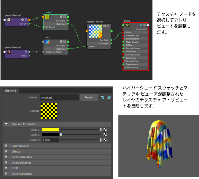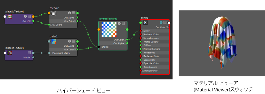たとえば、レイヤ テクスチャ(Layered Texture)の出力カラー(Out Color)出力を、Blinn のカラー(Color)入力に接続します。