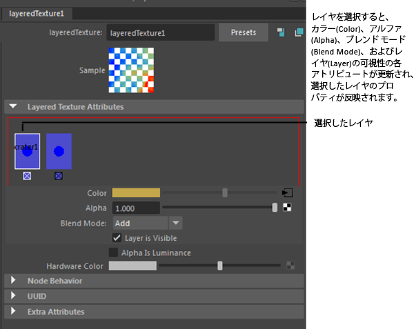 - レイヤ テクスチャ(Layered Texture)のアトリビュート エディタ(Attribute Editor)で、編集するレイヤを選択します。