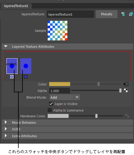 のアトリビュート エディタ(Attribute Editor)内のレイヤの順序を変更するには、レイヤ スウォッチを中マウス ボタンでドラッグします。