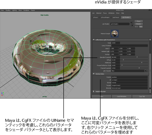 MAYA_CGFX マクロを使用すると、CgFX シェーダをカスタマイズし、同じ CgFX シェーダを使用する可能性のあるほかのアプリケーションとの互換性を失くことなく、Maya 固有のアトリビュートの注釈を含めることができます。
