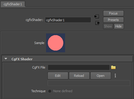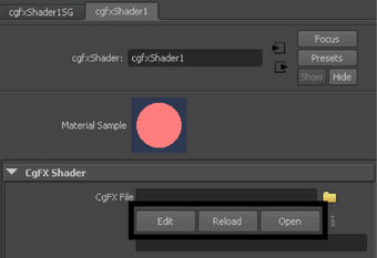 cgfxShader ノードのアトリビュート エディタ(Attribute Editor)で、Reload (リロード)、Edit (編集)、Open (開く)ボタンを使用すると、指定した FX ファイル上で該当処理を実行することができます。