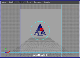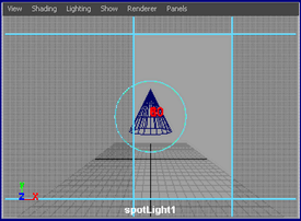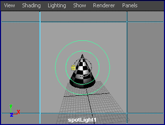 - 周縁部の角度(Penumbra Angle)の値を微調整すると、2 番目の円が表示されます。アトリビュート エディタ(Attribute Editor)で値を変更するか、インデックス マニピュレータ(Index Manipulator)のアイコンをクリックしてマニピュレータを使用し、次にパネル > 選択項目から見る(Panels > Look Through Selected)を選択して円を確認します。