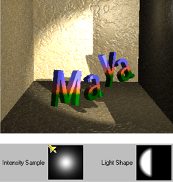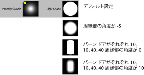 また、スポット ライトのアトリビュート エディタ(Attribute Editor)の最上部にあるライト シェイプ(Light Shape)と強度サンプル(Intensity Sample)を見て、照らし具合を確認することもできます。これらは、スポット ライトの値を変更すると変化します。