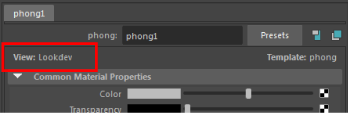 プロパティ エディタ(Property Editor)のラベルの線に ビュー:Lookdev と表示され、ノード アトリビュートが Lookdev モードで表示されていることが示されます。