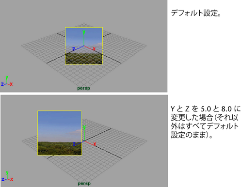 イメージ プレーンの中心の位置をシーンのリニア作業単位で指定します。イメージ プレーン(Image Plane)がカメラにアタッチ(Attached to Camera)に設定されている場合、センター(Center)は無視されます。