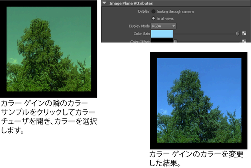 イメージ プレーンのすべてのカラーに適用されるスケール係数(イメージ プレーンのすべてのカラーにカラー ゲイン(Color Gain)の値が掛けられます)。たとえば、イメージ プレーンの緑色が強すぎる場合は、カラー ゲイン(Color Gain)を青色に設定すれば、緑色の不均衡を補正することができます。既定値は白(元のカラーに影響なし)です。
