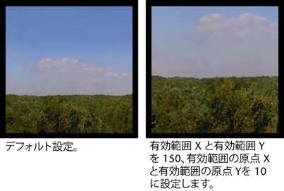 イメージ プレーン上に表示されるイメージ ファイルの原点の X 座標値(有効範囲の原点 X(Coverage Origin X): イメージ ファイルの左下隅から表示領域の原点までの横方向のピクセル数)と Y 座標値( 有効範囲の原点 Y(Coverage Origin Y): イメージ ファイルの左下隅から表示領域の原点までの縦方向のピクセル数)を指定します。これらのアトリビュート値を変更すると、イメージ プレーン上のイメージ ファイルのサイズと位置を調整することができます。既定値は縦横とも 0 です。