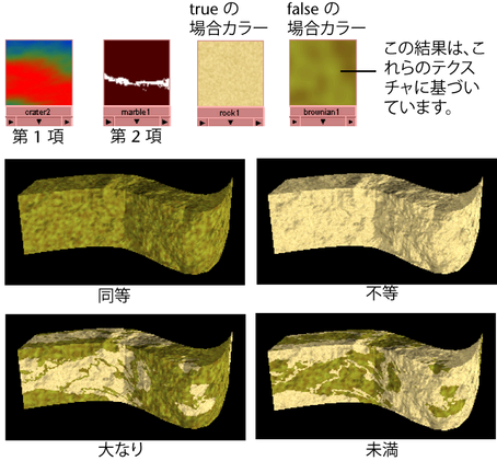 この例では、A の値と B の値が等しくない場合は、true の場合カラー(Color If True)が出力カラー(Out Color)に代入されます。A の値と B の値が等しい場合は、false の場合カラー(Color If False)が出力カラー(Out Color)に代入されます。