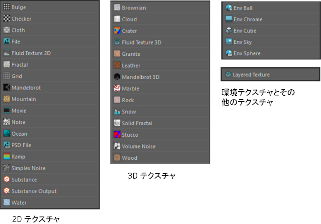 ハイパーシェード(Hypershade) 作成(Create)タブとレンダー ノードの作成(Create Render Node)ウィンドウから、2D テクスチャ(2D Textures)、3D テクスチャ(3D Textures)、環境テクスチャ(Env(ironment) textures)、その他のテクスチャ(other textures) (レイヤ テクスチャ(Layered Texture))を作成できます。