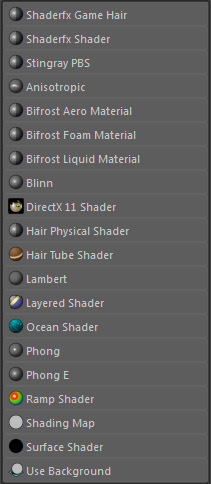 ハイパーシェード(Hypershade) 作成(Create)タブ とレンダー ノードの作成(Create Render Node)ウィンドウから、サーフェス(Surface)マテリアル、ボリューム(Volumetric)マテリアル、ディスプレイスメント(Displacement)マテリアルを作成できます。サーフェス マテリアルの詳細については、「Maya のマテリアル」を参照してください。