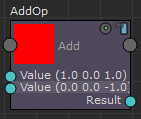 アイコンをクリックすると、Add ノードのスウォッチが赤色に変わります。どの外部入力ノードにも接続せずに、2 つの入力既定値(1, 0, 1) + (0, 0, -1) = (1, 0, 0)を追加しました。
