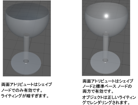 Stingray PBS を使用して、両面マテリアルを作成するときに、オブジェクトのシェイプ ノードと Stingray PBS の Standard Base ノードの両面(Double Sided)アトリビュートを有効にする必要があります。これにより、オブジェクトは Maya で正しいライティングをレンダーするようになります。オブジェクトのシェイプ ノードのみで有効にした場合は、ライティングはシェーダに対して正しくない可能性があります。