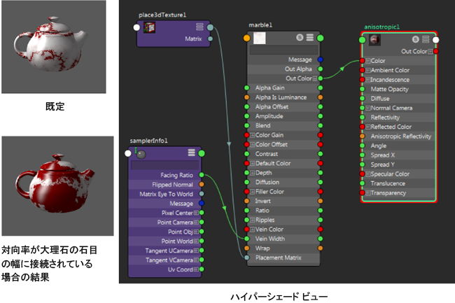 最初の例では、サンプラ情報(Sampler Info)の対向率(Facing Ratio)アトリビュートは大理石(Marble)テクスチャの木目の幅(Vein Width)に接続されています。
