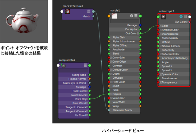 次の例では、サンプラ情報(Sampler Info)のポイント オブジェクト(Point Obj)アトリビュートは、大理石(Marble)テクスチャの波紋(Ripples)アトリビュートに接続されています。