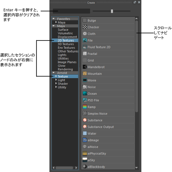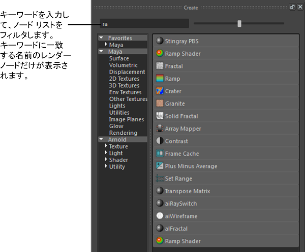 作成するレンダー ノードのキーワードを入力します。キーワードを入力すると、リアルタイムに作成(Create)タブの右側のパネルが更新され、入力内容に一致する名前のレンダー ノードのみが表されます。