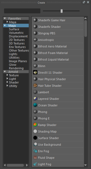 ハイパーシェード(Hypershade)を最初に開いたときには、左下に作成(Create)パネルが表示されます。このパネルからノードを選択し、さまざまなレンダリング エフェクトを作成できます。