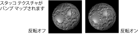 テクスチャのカラーをすべて反転(黒を白に、白を黒に、など)します。反転(Invert)の既定値はオフです。たとえば、反転アトリビュートをオンに設定すると、バンプ/ディスプレイスメント マップの凹凸の領域が逆になります。
