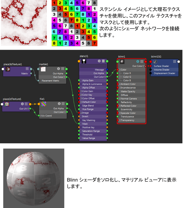 ステンシル(Stencil)の透明度を表します。テクスチャ全体の透明度を制御するのに使用します。テクスチャの選択した領域の透明度を制御するには、別のテクスチャをマスク(Mask)にマップします。