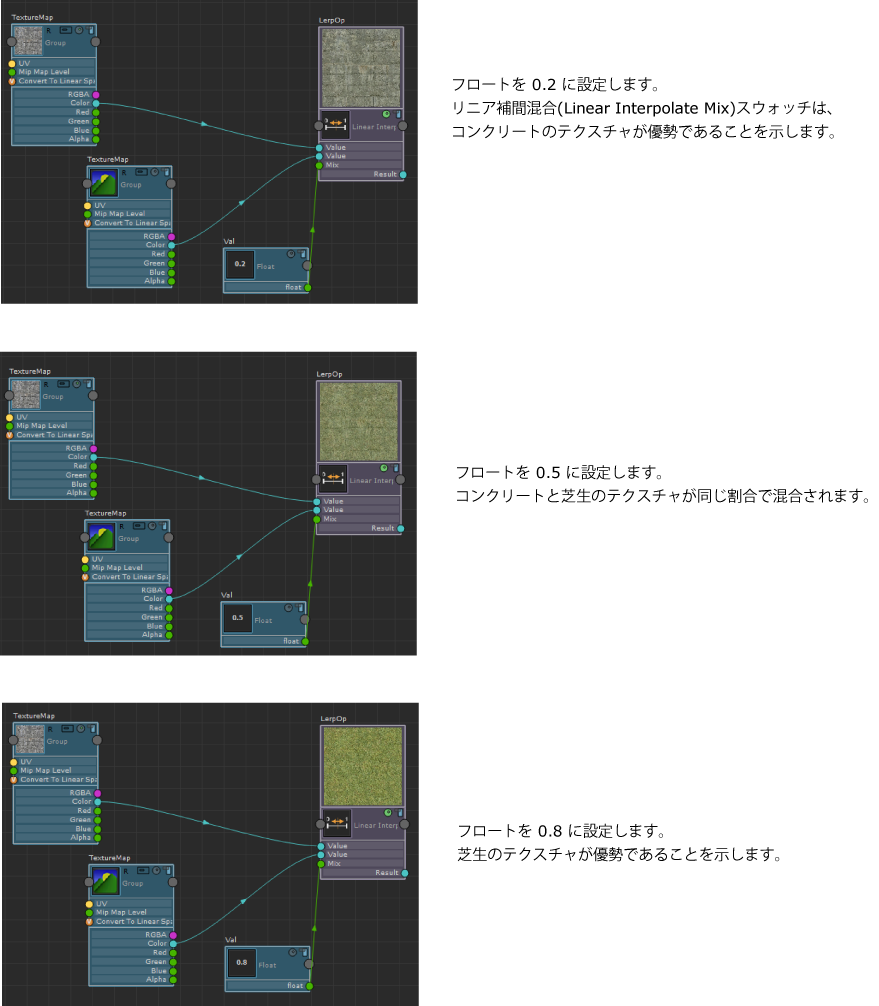 Float ノードでは、各テクスチャがブレンド結果に与える影響の大きさをコントロールすることができます。たとえば 0.2 に設定すると、得られるテクスチャは、コンクリートのテクスチャが支配的になります。0.8 に設定すると、得られるテクスチャは、芝生のテクスチャが支配的になります。0.5 に設定すると、2 つが均等に混合します。