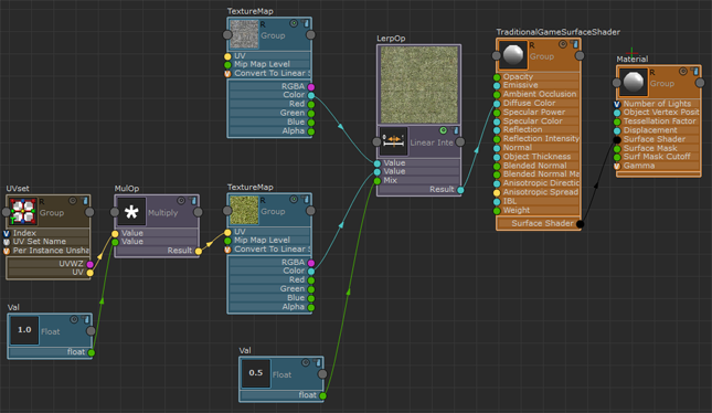 3 つのノード、Color、TraditionalGameSurfaceShader および Material が自動的に作成されます。Color ノードを接続解除することができます。このノードは次のワークフローには必要ありません。