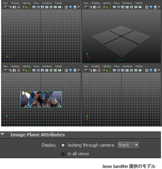 フリー イメージ プレーンをすべてのビューで表示するか、指定したカメラ越しのみで表示するかを選択することができます。表示 > カメラ越しの視点(Display > looking through camera)の横にあるドロップダウン リストを使用して、イメージ プレーンの表示に使用するカメラを選択することができます。