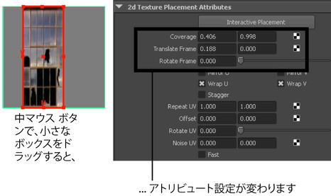 マニピュレータ ハンドルをドラッグすると、place2dTexture のアトリビュート エディタ(Attribute Editor)の有効範囲(Coverage)、フレームの移動(Translate Frame)、フレームの回転(Rotate Frame)のアトリビュート設定が変更されます。テクスチャを、ラベルのように伸長、収縮、移動、回転させることができます。