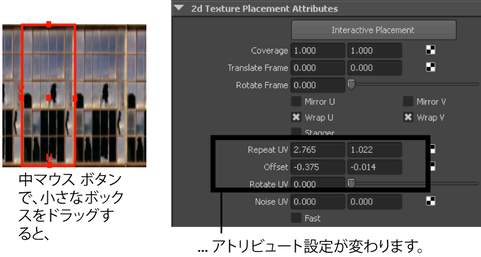 マニピュレータ ハンドルをドラッグすると、place2dTexture のアトリビュート エディタ(Attribute Editor)の繰り返し UV (Repeat UV)、オフセット(Offset)、UV の回転(Rotate UV)のアトリビュート設定が変更されます。テクスチャを、壁紙のように伸長、収縮、移動、および回転させることができます。