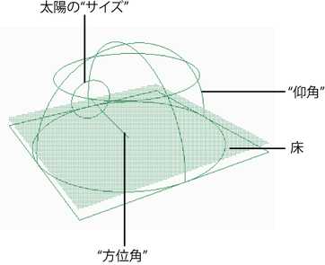 床を基準とした場合の太陽の仰角(度単位)。値の範囲は -90 ~ 90 です。スライダ範囲は 0 (日の出/日没時) ~ 90 (正午)です。既定値は 45 です。