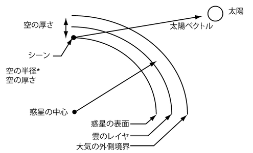 たとえば、空の厚さ(Sky Thickness)が 1000 で、空の半径(Sky Radius)が 50 である場合、空の外周半径は 1000 x 50 = 50,000 単位となり、惑星の半径は(1000 x 50) - (1000 x 1) = 49,000 単位となります。