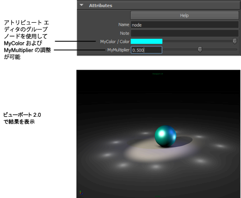 - グループ ビューを終了して、グループ ノードを選択します。グループ ノード アトリビュート エディタが、アトリビュートとして MyColor と MyMultiplier をエクスポーズします。