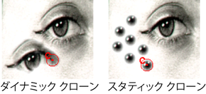 ダイナミック クローンでは、クローン ソースはペイントに従って移動します。次のダイナミックなクローン(DynamicClone)の例では、上の目の小さな領域がクローン ソースとして設定されています。目の下をペイントすると、上の目が徐々に再生されます。スタティックなクローン(StaticClone)の例では、瞳孔がクローンされ、スタンプされています。