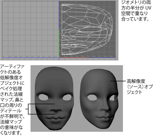 - キャラクタ上で法線マップをミラーするときに継ぎ目が現れないようにするには、ソース ジオメトリが左右対称であることを確認してください。つまり、キャラクタの一方の側がもう一方の側と同じであることを確認してください。これは、スキャン データから派生されたサーフェス メッシュを操作するときに特に重要になります。