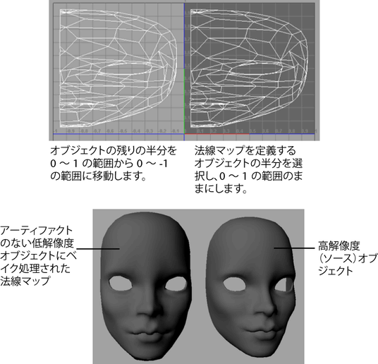 - 法線マップを定義するオブジェクト(たとえば、顔)の半分を選択します。この半分は 0~1 の UV 範囲のままにします。