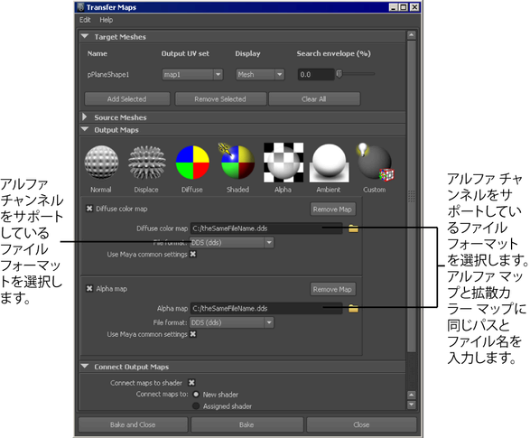 同じ幅および高さのマップを複数作成する場合は、マップの転写(Transfer Maps)ウィンドウの Maya 共通出力(Maya Common Output)セクションにマップの設定を入力することによって、それを再使用することができます。