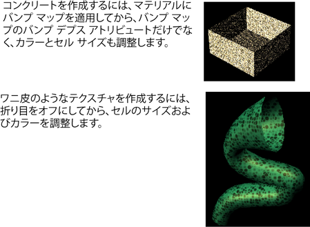 皮革を表現します。ヘビやワニの革、発砲スチロール、コンクリートなどのマテリアルの表現に利用することもできます。